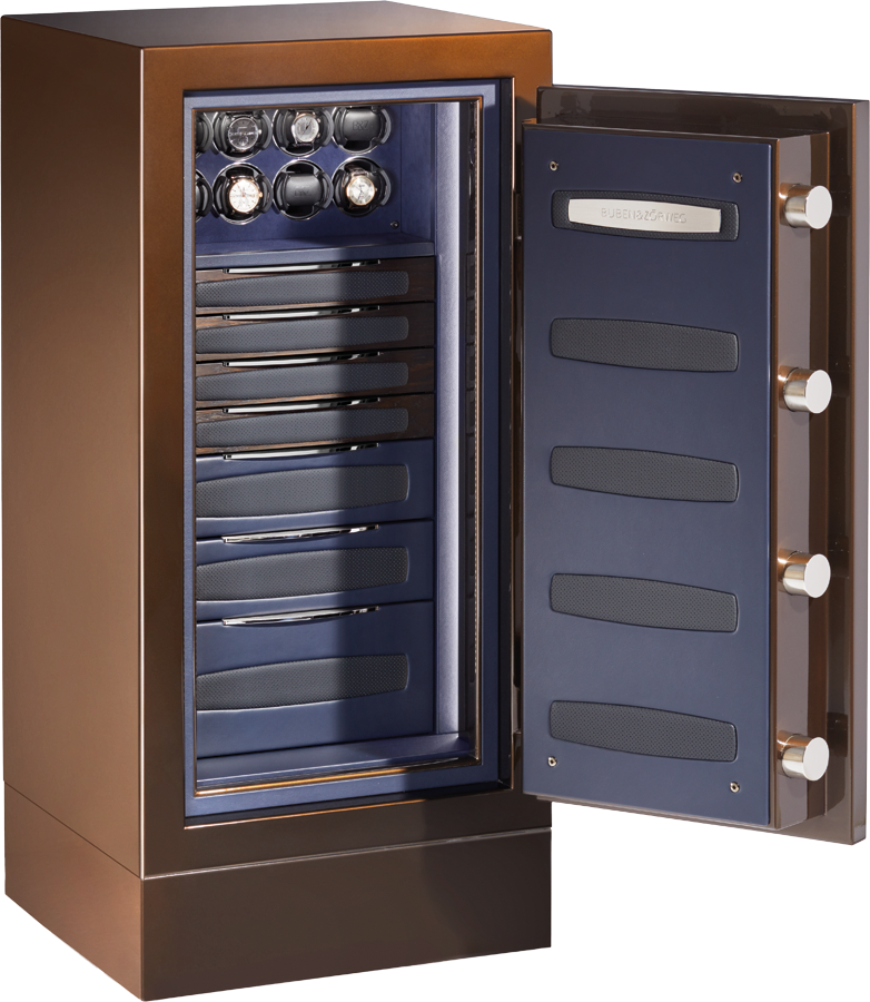 combination options are ensured by the locking system of the Taurus safe from the German brand Buben & Zörweg. You have to enter a 7-digit number to open the safe. Eight watches can be placed inside the safe on the characteristic “Time Movers”. Five drawers also provide space for other valuables. The company has been producing high-quality, custom-made storage and presentation cases since 1995.