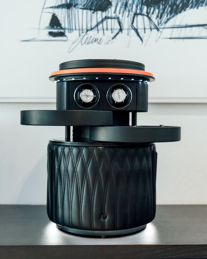 La Grande Illusion Chiron 300 est donc une création unique qui évoque une sculpture, couronnée par l’incomparable horloge tourbillon Flying Minute de Buben & Zörweg. Le coffre-fort multifonction de 215 kg surprend par le fait qu’une fois déverrouillé, exclusivement par un capteur biométrique d’empreintes digitales ou une puce à transpondeur, le coffre-fort et son contenu glissent élégamment vers le haut. La Grande Illusion Chiron 300 élève alors les objets de valeur conservés à l’intérieur, comme une montre, un collier ou les clés de l’hyper-sportive, à partir d’une colonne. Un tiroir spécial qui protège des ondes radio a été développé pour garantir un stockage des clés particulièrement élégant et sécurisé.