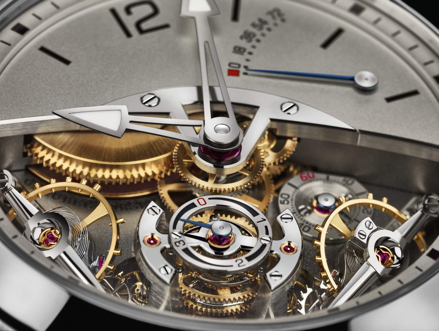 Heures et minutes, petite seconde, rotation du différentiel sphérique constant en 4 minutes, réserve de marche sectorielle de 72 heures