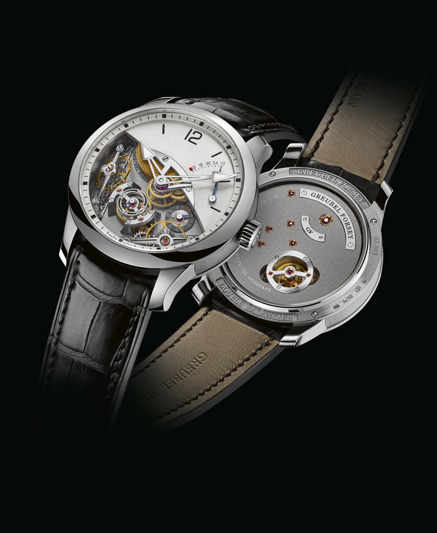 Or gris, 43 mm, verre saphir bombé, fond saphir, vis de sécurité en or, gravures en relief polies « Double Balancier » et « Greubel Forsey » sur fond martelé main