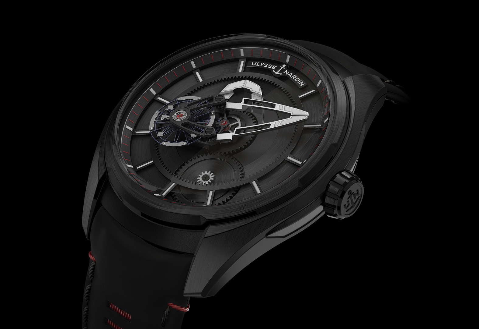 Une pièce d’avant-garde, pour collectionneurs avertis, qui rebat totalement les conventions de style, d’affichage, et les partis pris technologiques en vigueur en horlogerie depuis deux siècles. Sans cadran ni aiguille, Ulysse Nardin a créé un garde-temps hors norme où la forme et le design se mettent au service des fonctions.