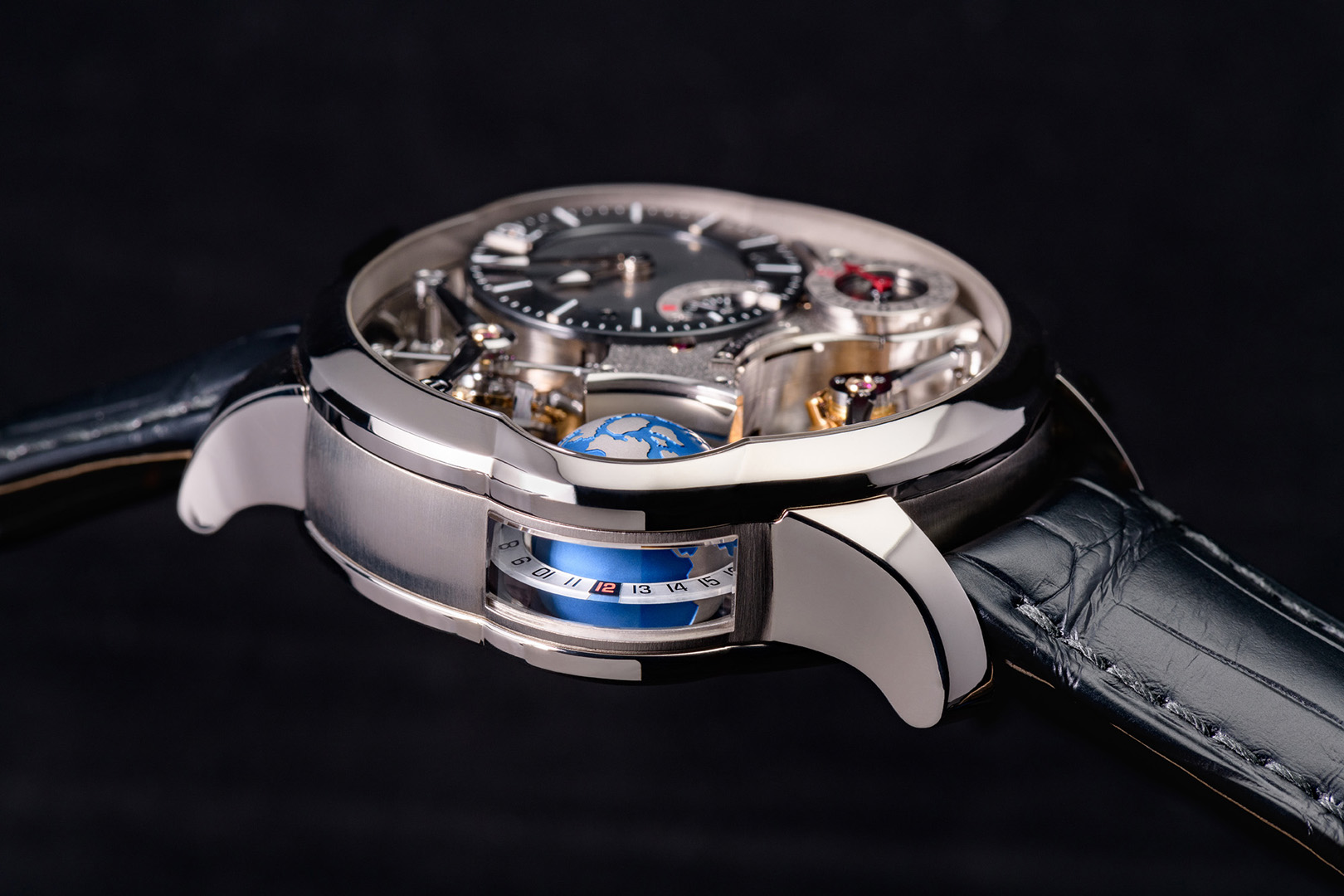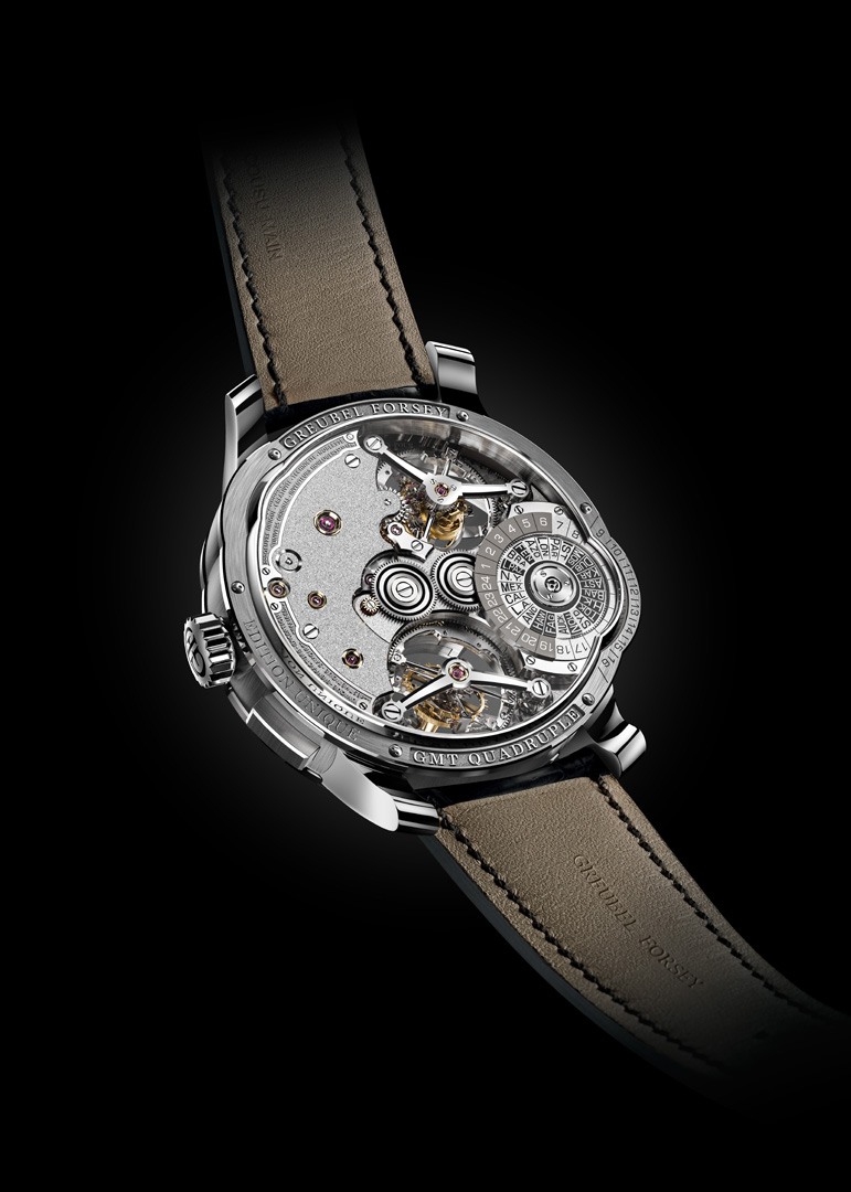 La conjonction de l’inclinaison de la cage intérieure et des vitesses de rotation différenciées des deux cages vise à annuler les écarts de marche dus à l’attraction terrestre dans toutes les positions usuelles. Concernant le GMT, l’indication d’un second fuseau horaire sur un cadran auxiliaire distinct se marie à une heure universelle permettant de lire de manière intuitive toutes les heures de la planète grâce à une première mondiale : un globe terrestre miniaturisé effectuant un tour complet sur lui-même en 24 heures, à l’image même de notre planète Terre.