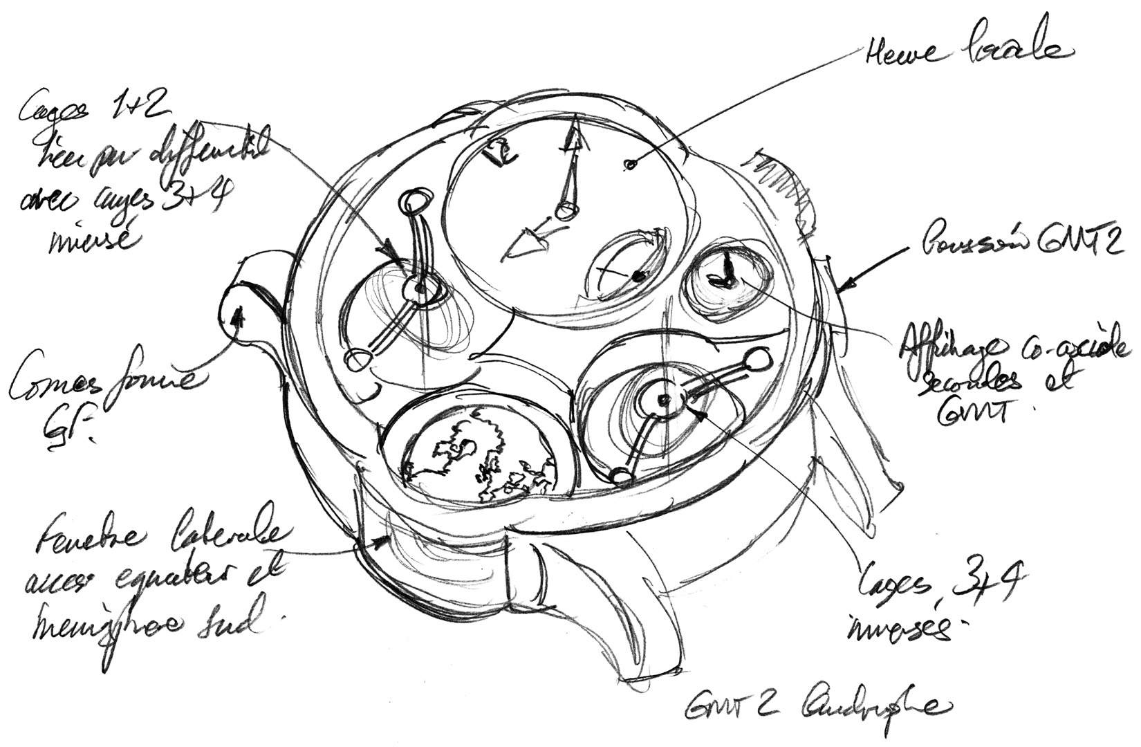 GMT, 2e fuseau horaire, heure universelle terrestre avec jour/nuit par globe rotatif, heure universelle sur 24 fuseaux, villes appliquant l’heure d’été, fenêtre latérale sur l’équateur et l’hémisphère sud, poussoir GMT, Quadruple Tourbillon, heures et minutes, petite seconde, réserve de marche.