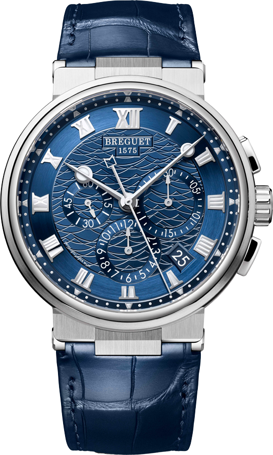 Dotée de cette nouvelle esthétique, la Marine Chronographe de 42,3 mm dispose d’un chronographe à aiguille centrale, distinguée par ce subtil détail maritime et complétée par deux sous-cadrans à 3h pour les minutes et à 6h pour les heures. La petite seconde est indiquée à 9h, dans une configuration « tricompax » dont la lisibilité a fait ses preuves. Une indication de la date entre 4h et 5h donne la touche finale à cette création à l’allure sportive, avec une ouverture agrandie pour en améliorer la lecture. Breguet interprète ce nouveau modèle avec un boîtier en or blanc et cadran bleu en or guilloché, qui rappellent son ascendance océanique.