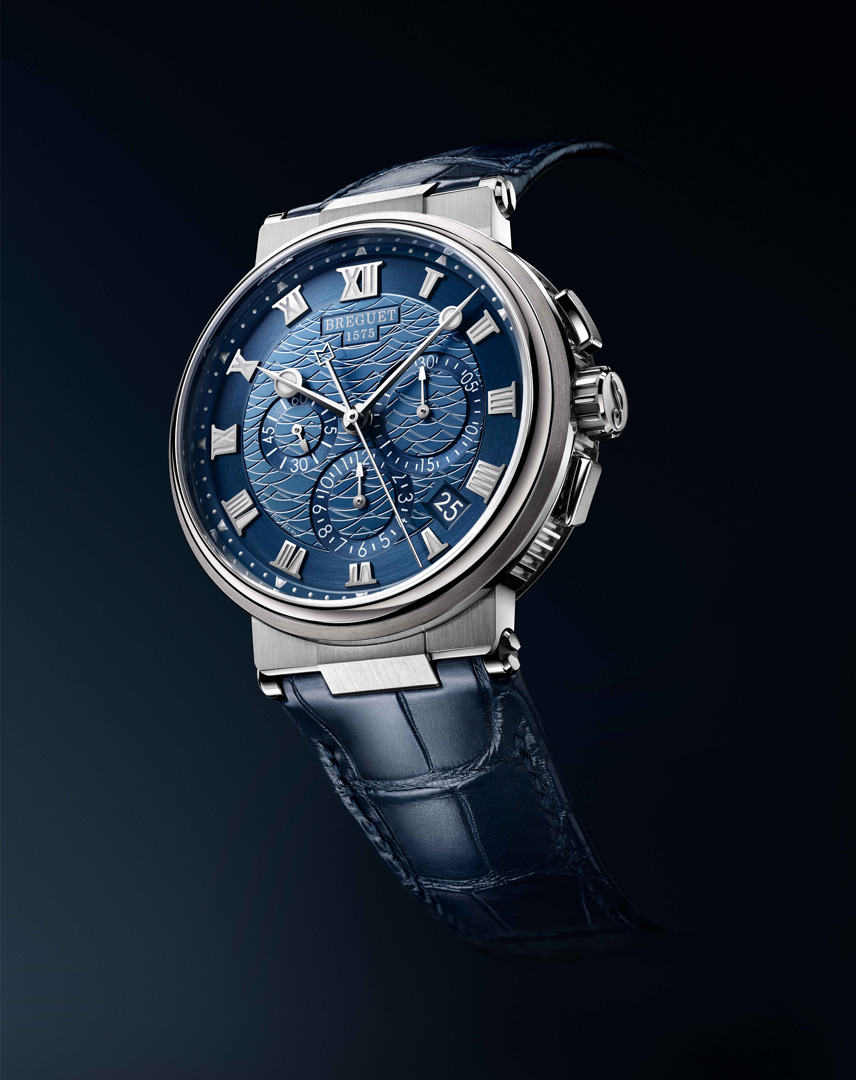 . Tous les index, en or blanc et individuellement apposés, ont été redessinés. Les cornes ont été retravaillées, plus modernes et tendues. Les aiguilles sont dotées, pour les heures et minutes, d’un repère luminescent rond qui favorise leur lecture par faible luminosité. L’aiguille centrale se voit dotée d’un nouveau contrepoids que les amateurs de navigation reconnaîtront : le « B » de Breguet, symbolisé suivant le véritable drapeau utilisé dans la marine pour signifier cette lettre. Enfin, une nouvelle finition guillochée, grande spécialité de la maison Breguet, a été développée en fond de cadran pour évoquer les allants maritimes de la pièce.