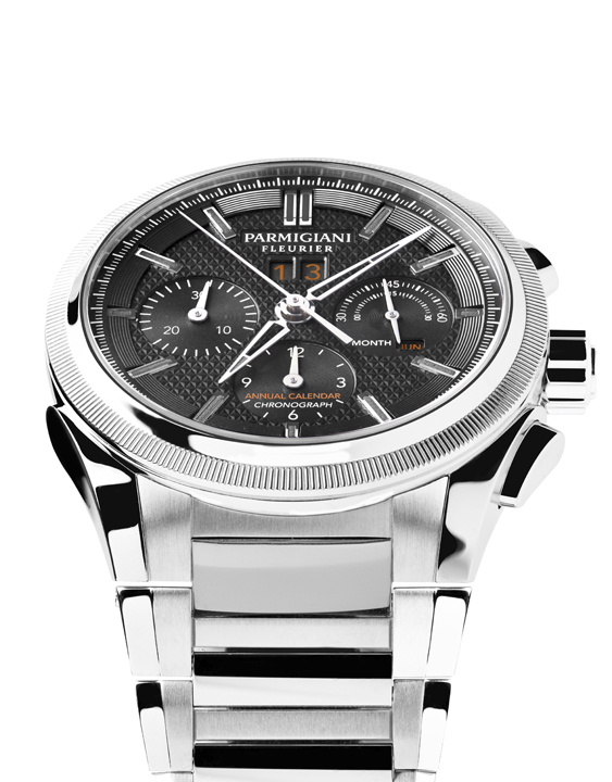Construite autour d’une boîte acier avec bracelet intégré alternant surfaces polies et satinées, son cadran joue un contraste tout en nuances entre le noir et le gris. Les larges aiguilles squelettées ne cachent rien du cadran finement guilloché où se déploient une grande date à 12h, complétée d’une petite seconde à 6h. Cette dernière, ingénieuse, décompte ses 60 secondes en deux secteurs superposés que vient balayer une aiguille à deux longueurs différentes.